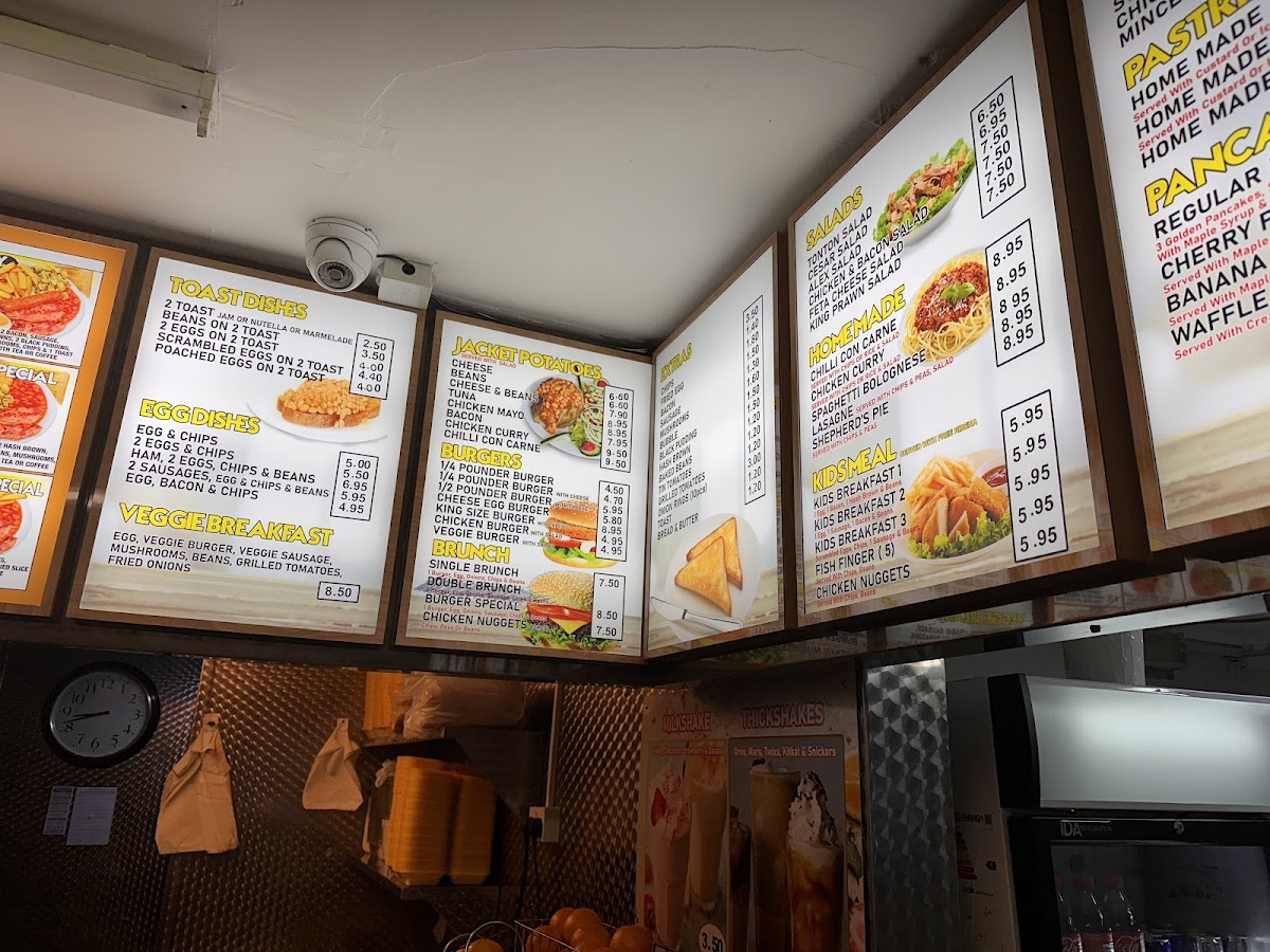 The breakfast selection shines with hearty egg dishes, including favorites like Ham, Eggs, Chips & Beans and Egg, Bacon & Chips, perfect for fueling your day. For those seeking a lunch delight, dive into their juicy burgers—from classic 1/4 Pounders to the towering King Size Burger—there’s a satisfying bite for every craving.